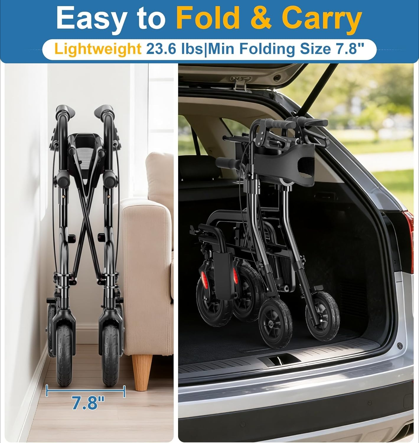 - Compact folding and easy storage designed for modern living, this seat-up walker folds up in seconds with a one-handed mechanism. The folded compact size makes it ideal for travel and storage, it fits perfectly into trunks and car cabinets.